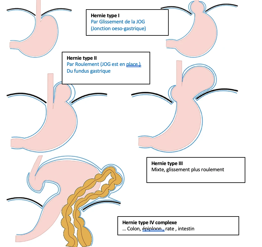 La chirurgie de la hernie hiatale est le plus souvent indiquée pour les types II, III et IV, en particulier en cas de symptômes ou de complications (douleurs, anémie, troubles respiratoires, risque de volvulus).